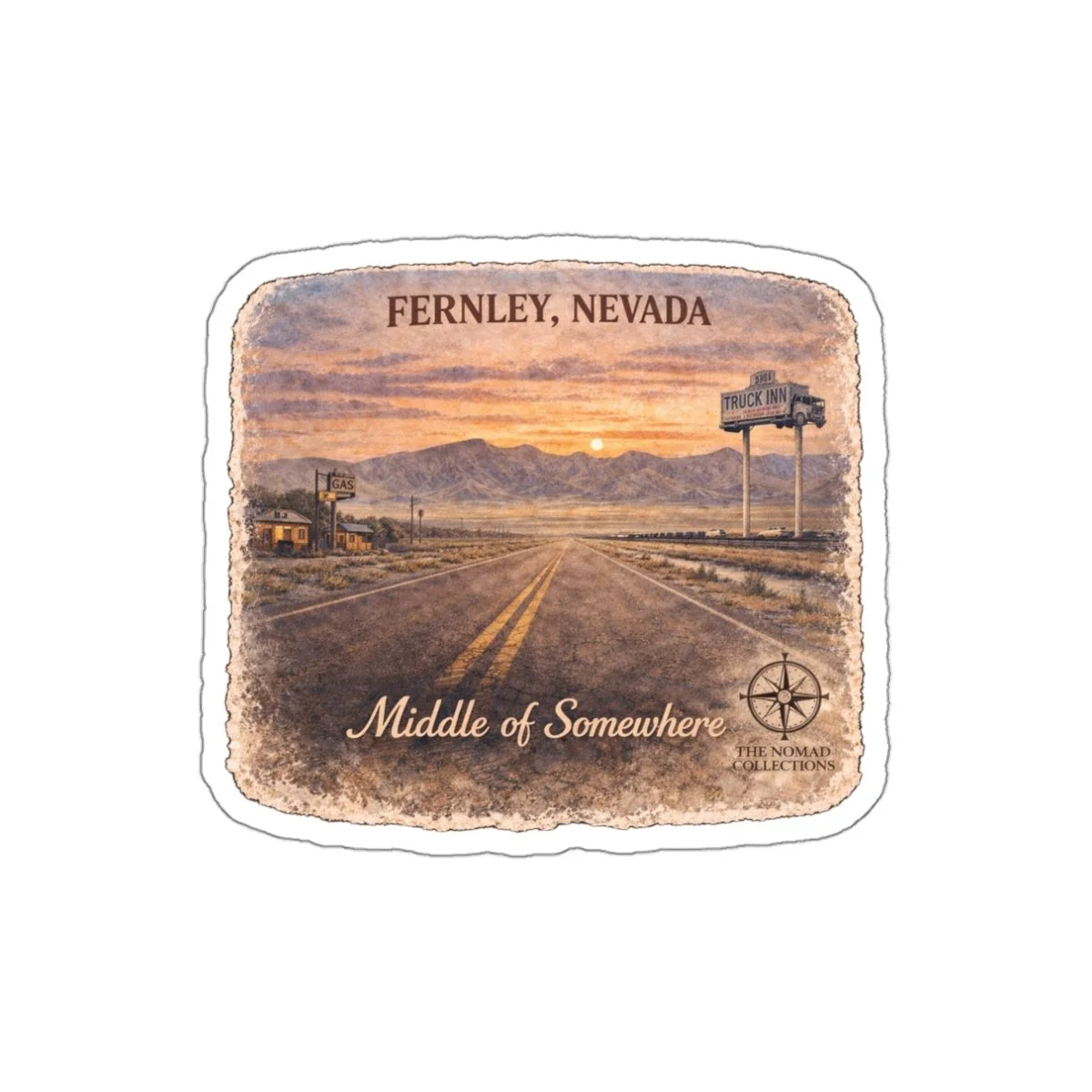 A weathered, wanderlust-ready Fernley Nevada die-cut sticker capturing a quiet desert sunset and the open road. Designed with warm sepia tones and a vintage texture, this road trip travel decal brings an old-map feel to your everyday gear.