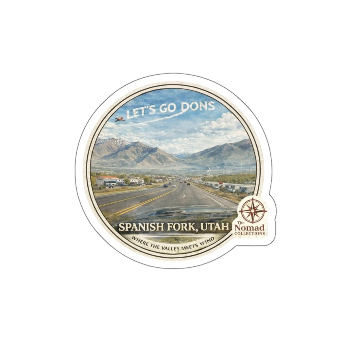 Designed in a circular, postcard-inspired layout with a subtle compass detail, this sticker embodies the spirit of exploration and hometown pride—complete with a nod to local culture with “Let’s Go Dons.” A perfect addition to your laptop, water bottle, car, or travel journal, it brings a piece of Spanish Fork wherever your journey takes you.
