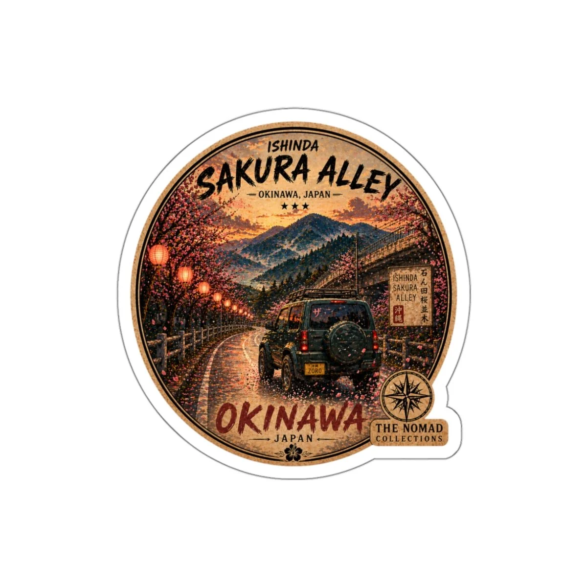A warm, travel-inspired die-cut sticker capturing a quiet evening drive through Sakura Alley in Okinawa, Japan. A compact 4x4 cruises down a lantern-lit road, cherry blossoms arching overhead while misty mountains fade into the distance. The palette leans vintage and soft—warm ambers, deep greens, and dusky pinks—giving the design that signature postcard feel.